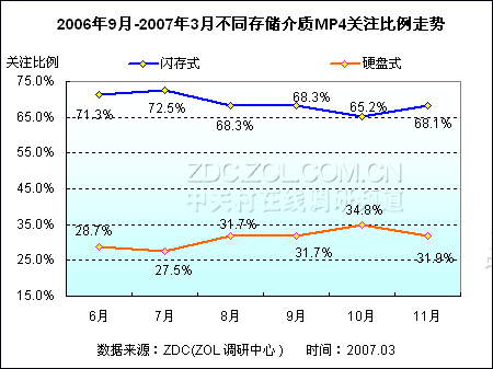 通过对六个月的关注数据检测,ZDC统计得出2006年9月至2007年3月不同存储介质MP4关注走势对比状况。结果显示,虽然硬盘式MP4在市场上的关注度处于上升状况,但是变化及波动幅度不大,并且与闪存式MP4在关注度上保持30个百分点以上差距。
