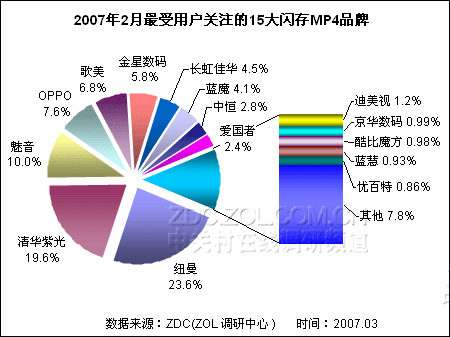 2007年2月,消费调研中心ZDC对中国MP4市场进行关注调查,对于MP4市场来说,出现众多厂商将产品重新调整的现象。通过关注调查,ZDC不仅获得各大厂商在用户心中的地位分布,同时也揭示了网友在购买闪存MP4播放器存在的一些主要特征: