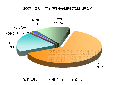 (图)2007年2月不同容量闪存MP4关注比例分布