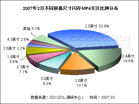 (图)2007年2月不同屏幕尺寸闪存MP4关注比例分布