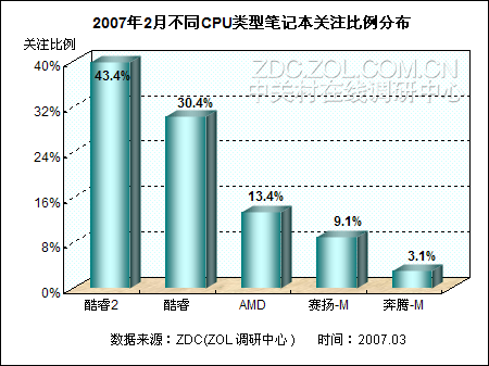 (图)2007年2月不同CPU类型笔记本的关注比例分布