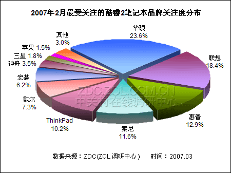 为了使消费者对2007年2月酷睿2笔记本市场有更深入的了解,使普通用户也能把握住市场的脉搏,明晰市场的发展方向,消费调研中心ZDC对2月酷睿2笔记本市场的用户关注度状况进行了调查,主要包括了品牌和产品两大方面。