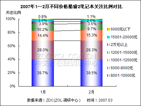 (图)2007年1-2月不同价格酷睿2笔记本关注比例对比