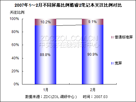 酷睿2笔记本市场也不例外,2月份宽屏机型占据了该市场九成以上的关注份额,同上月相比,其关注度提升了1.1个百分点。而普通标准屏酷睿2笔记本的关注度则逐月下降,本月仅获得9.1%的关注度。