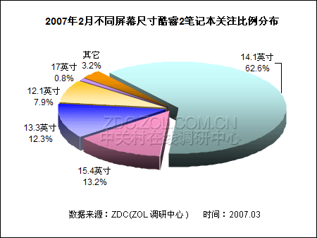 (图)2007年2月不同屏幕尺寸笔记本关注比例分布
