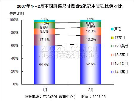 (图)2007年1-2月不同屏幕尺寸酷睿2笔记本关注比例对比