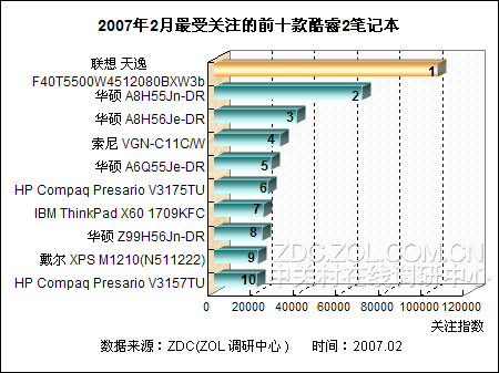 根据消费者的关注状况,消费调研中心ZDC得出2007年2月最受关注的十大酷睿2笔记本品牌,具体排行如下图所示。