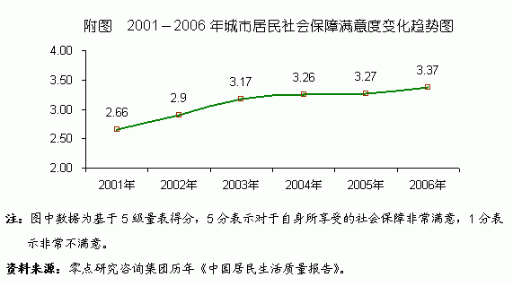 零点公司关于居民生活质量的历年研究结果表明:在2001年-2006年期间,城市居民社会保障满意度一直在低幅平稳增长,表明尽管当前社保制度依然存在不少问题,但公众对于政府在社保领域的工作进步给予了肯定,他们承认自己享受的社会保障水平是在逐年地进步提升。