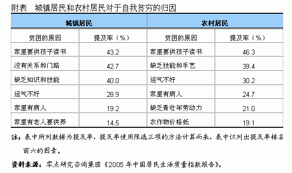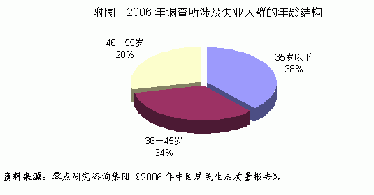 零点公司的调查表明:2001-2005年间,下岗就业问题连续五年蝉联受关注度首位,2005和2006年的调查还发现,城镇失业者开始出现低龄化和高学历化趋势。在2006年的调查中,17.5%受访家庭中存在失业人口,这其中18.6%家庭存在多人同时失业现象。在调查涉及到的失业人口中,35岁以下者占38.1%,36-45岁者占33.5%,大专以上学历者占4.9%,高中/中专/技校学历者占46.5%。