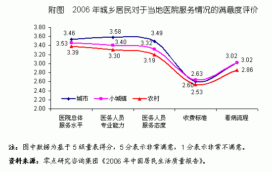 医疗问题严重下拉民众生活质量已是不争的事实,而医疗问题的根源在于医疗费用上涨幅度高于收入增长幅度。零点2006年的调查显示:尽管对于医院看病流程设置有所不满,城乡居民对于医院的总体服务水平、医务人员的专业能力和服务态度还是基本肯定的,而对于医院的收费标准问题,则普遍表示不满意。在本次调查的3780名城乡居民中,12.2%者表示在2005年9月~2006年9月这一年期间,自己或家人曾经因为费用问题,在需要去医院看病的时候没有去;另有6.5%者表示曾经因为费用问题,在需要住院治疗的时候没有去。在这部分因费用问题放弃求医、放弃住院治疗的群体中,绝大多数人没有统筹性医疗保险。