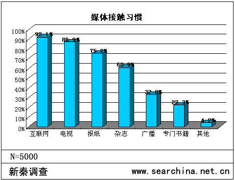 据新秦调查数据显示,互联网成为中国商务人士接触最多的媒体。超过九成的被访者平时能经常接触到互联网,而经常接触到电视媒介的人占86.9%,报纸和杂志媒介则紧随其后,20年前作为中国媒介主力的广播已经逐渐的被人们淡忘。