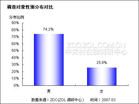 由图可见,本次调查的男性用户占据主流,达到整体市场的74.2%。女性用户参与调查的数量相对较少,与男性用户之比接近1:3。