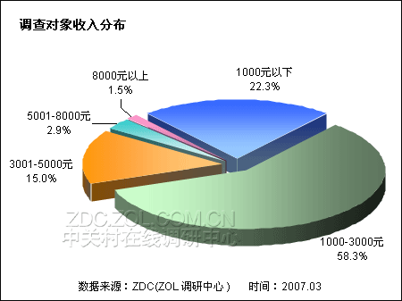本次调查中,收入在1000-3000元之间的人群占据参与调查用户的近六成。其次是1000元以下收入的人群,这部分消费者主要为学生,占据了22.3%。还有15.0%的消费者收入在3001-5000元之间。5000元以上中高收入人群在本次线上与线下调查的用户当中所占比例较少,累计不足5个百分点。