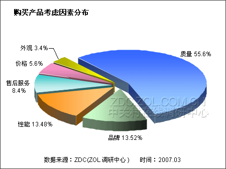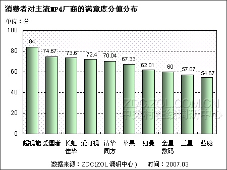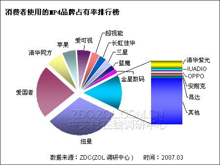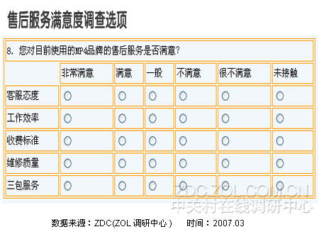 为了进一步了解MP4市场的整体满意度状况,在2007年的“3.15”期间,ZDC通过线上的网络调查与线下实地调查相结合的方式,对MP4品牌、产品质量以及售后服务这三个方面进行调查。