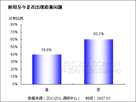 由上图可见,近四成的用户表示使用的MP4出现过不同程度的质量问题,而至今还未出现质量问题的产品占据六成以上的比例。出现这一数据主要是因为当前MP4市场上的购买力仍然不足所造成的,拥有产品的用户数量相对较少。