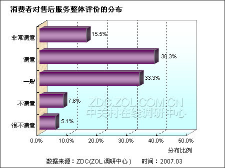 调查结果显示,对售后服务表示非常满意的用户仅有15.5%。表示满意的用户在整体市场上分布较高,接近四成。对售后服务做出“一般”评价的用户占据整体市场的三分之一左右。此外,还有7.8%与5.1%的消费者表示对售后服务不满意。