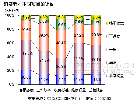 在这五个选项上,收费标准表现最差,其中,满意及非常满意的用户比例低于其他几个方面。并且用户对收费标准不满意和很不满意的用户所占比例也是高于其他项目的。由此可见,MP4播放器的售后服务收费标准为较多消费者所不满。