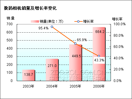 2006年年初,数码相机市场围绕着低端、价格战、千万像素、防抖、入门单反等关键词展开,并使得数码相机在市场上出现大范围普及的现象。根据赛迪顾问的销量数据显示,2006年数码相机的销量达到600多万台,增长率高达40个百分点以上。以下是赛迪数据中2003年至2006年数码相机在市场上的销量及增长率状况。