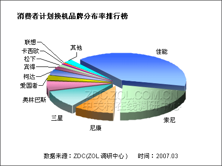 从2005年至今短短两年左右的时间里,数码相机主流像素实现了四级跳,从300万像素产品经历500万、600万、700万,目前主流像素停留在了800万。而伴随着像素的升级,防抖技术的实现、大屏幕产品的更型换代,很难避免消费者更新产品的意向。鉴于此,ZDC也对消费者进行了换机品牌的调查。