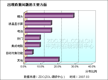 其次,镜头作为重要的元件,其也是数码相机出现质量问题最为集中的方面,其他质量问题表现较少。