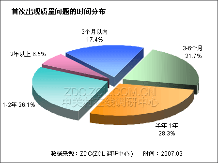 根据用户的反映,ZDC对首次出现质量问题从时间的角度来进行考察。而距购机时间越短,则表明产品的质量表现相对较差,反之则表示该产品质量方面表现较好。