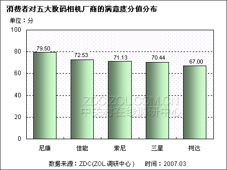 调查结果显示,在尼康、佳能、索尼、三星与柯达这五大厂商当中,消费者对尼康的市场满意度分值最高,超过佳能、索尼、三星与柯达这四家厂商。佳能、索尼以及三星这三家厂商的满意度分之接近,均在70-73之间。柯达是这五家厂商当中最低的一家,不足70分。