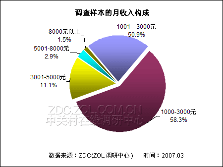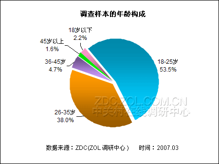调查对象年龄普遍集中在18至25岁之间,在此年龄段的样本比例达到53.5%,其次是26-35岁消费群体占38.0%的比例,而18岁以下与36岁以上的消费群体在整体市场中所占比例不高。从调查结果,反映出16至35岁年龄段是目前上网频率最高也是对IT产品需求量最大的用户群。