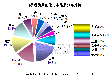 国内最大的PC厂商联想成为本次调查中拥有率最高的笔记本品牌,占据19.7%的比例。ThinkPad位于排行榜的第二位,有16.0%的消费者拥有该品牌的笔记本电脑,可见消费者对商务型笔记本的偏爱。