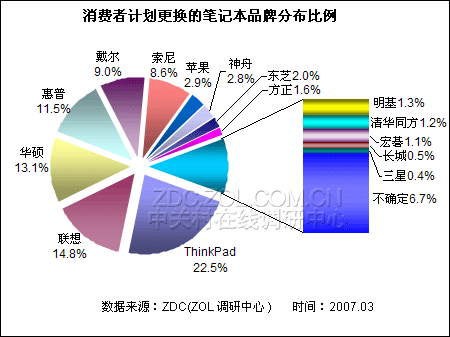 在计划更换笔记本产品的用户当中,ThinkPad整体比例提升,高出整体实际购买用户5.5个百分点,达到22.5%。可以看出,消费者对ThinkPad笔记本的青睐,也在一定程度上反映出ThinkPad的市场发展潜力较大。