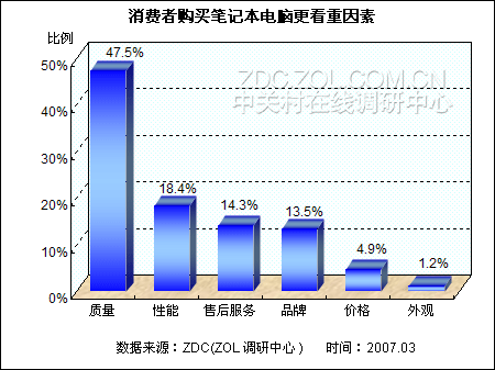 通过调查看出,消费者购买笔记本时,最看重的是产品的质量,性能、售后服务、品牌、价格与外观的影因素所占比例依次降低。