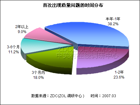 ZDC对购买笔记本后第一次出现质量问题的时间分布状况进行了调查。需要指出的是,距购买笔记本的时间越短,则表明产品的质量表现相对较差,反之则表示该产品质量方面表现较好。
