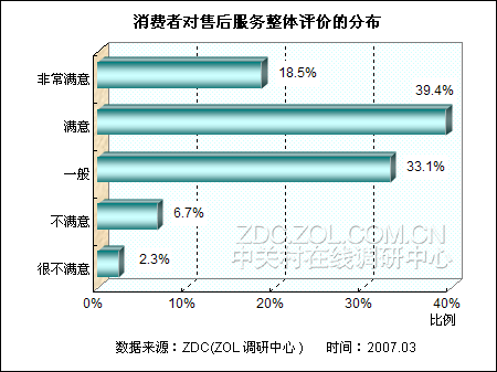 调查显示,对笔记本售后服务表示非常满意仅占18.5%。近四成的消费者对笔记本整体市场的售后服务表示满意。其次,有33.1%的用户认为笔记本市场的售后服务一般。仅有6.7%与2.3%的消费者表示对售后服务不满意及很不满意。