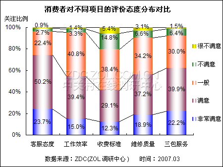 以下消费者对客服态度、工作效率、收费标准、维修质量与三包服务五大方面的满意度评价状况。