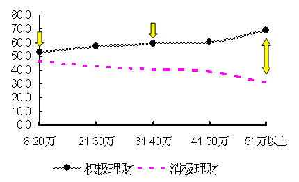 我国先富群体的出现无疑是改革开放以来的重大阶段性成果,同时他们也是我国在新经济环境下,经济持续稳定地增长中越来越重要的力量。从高收入人群理财动态指数(金葵花理财指数)的调查结果中表明,先富裕起来的富人群体中,教育背景确实不十分完整。对比同等学历的人在两类人群中的分布,我们可以发现拥有大学文化程度的富人中, 有60.2%是投资/消费活跃的群体,39.8%是消极群体,而在拥有初中文化的群体中, 只有42.1%投资/消费活跃的群体, 57.9%的人属于消极群体。从另外一个角度来看,消极群体对于金融一般知识和技能,对于具体投资工具的知识和技能都掌握很低,调查显示“自己对专业投资理财知识了解程度”?在投资/消费的活跃的群体中,回答较为肯定的为75.72%。而在消极群体中为24.5%。而且消极群体还对于现有专业服务机构了解不够,回答“自己对专业投资理财服务机构了解程度?”时,在投资/消费的活跃的群体中,比较不了解的占38.7%,而在消极群体中,这一比例高达61.3%。