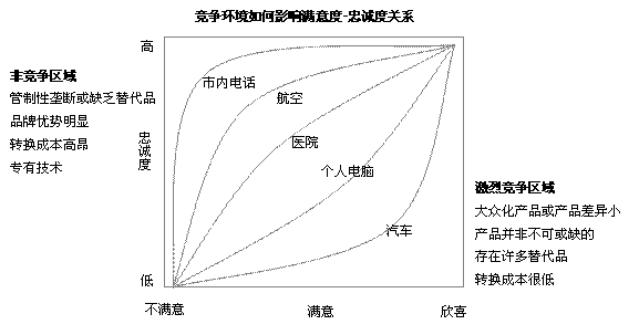 意的客户和欣喜的客户在忠诚度上有着天壤之别。(参见图:竞争环境如何影响满意度-忠诚度关系)从汽车行业陡峭的曲线就可以看出,相比