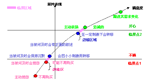 ,在这三个区域间有两个不连续的临界区域。从下图我们可以看出,当属性表现低于临界点1时,客户表现为不满意,在行为上则有“被问及时