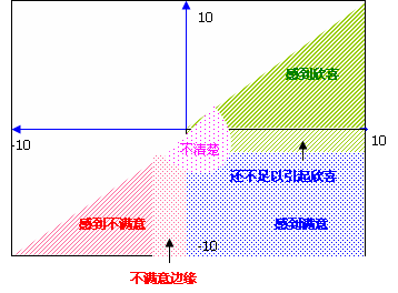 一个欣喜的阈限(临界点2,也即问题B),另一个是不满意的阈限(临界点1,也即问题D)。这两个阈限将整个满意度空间划分为三个区域: