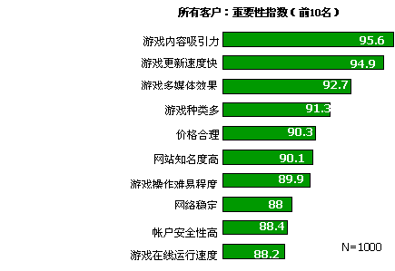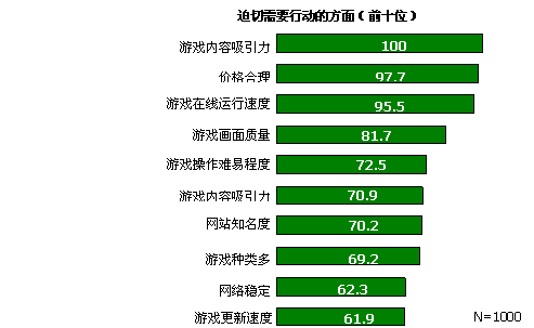 为100,指数越大,表明越需要采取行动。由下图可以看出,要提示总体满意度必须从五个方面尽快行动:“游戏内容吸引力”、“价格合理”
