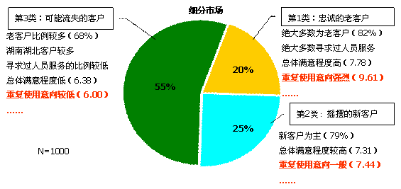 MOSTER模型也可以根据不同的客户在产品/服务的各个方面的满意度表现进行聚类分析,得出三个细分市场:忠诚的老客户(20%)、摇摆