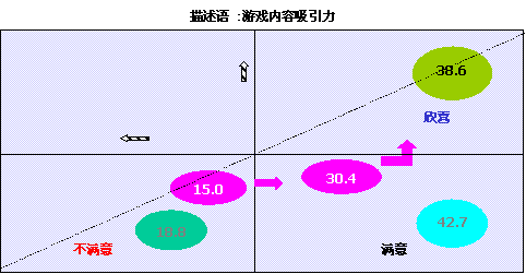 状态或者从原来满意状态转换到欣喜状态。数字越大,表明可以改变的人群越多。如下图“游戏内容吸引力”这一属性的边际效用指数就等于