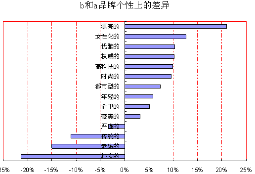 我们可以看到,b品牌的品牌个性特征在“女性”、“漂亮的”、“优雅”等表现非常明显,而a品牌的品牌个性特征在“朴实”、“老练”、“传统”上表现非常明显。