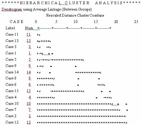 因子分析和聚类分析除了在消费者心理分析上得到广泛应用,在品牌研究中一样可以大展拳脚,和主成分分析前半截分析一样(但是因子分析要进行旋转),得到因子与诸指标的相关数据、各品牌的因子得分之后,再根据因子得分进行聚类分析,通过冰柱图或树图可以很快知道样本聚类的数量,如下: