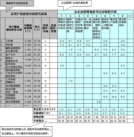 第二:需要企业跨部门合作,在影响满意度驱动要素的手段方面达成共识,在这些手段对各驱动要素的影响大小,实施难度,投入大小等方面都达成共识。在确定这些手段极其相互关系的的时候,由于各部门还不知道最终的结果(哪些手段将会成为企业近期主要采取的手段,这涉及到投入、责任等等),因此没有足够的动力从本位主义出发去扭曲实际的情况。这个过程非常重要,需要企业高层的参与。如果可能,迪纳公司的参与可以提高这部分工作的质量。通过培训,企业也可以自身完成这部分工作。