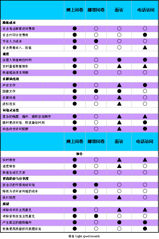 从以上表格可以看出网上研究可以调动受访者的视觉听觉以多媒体的形式灵活生动的展现问卷内容,从而使受访者对调查的概念,产品有更加全面深入地了解,提高他们对问卷的兴趣,有助于给出客观真实的答案;同时复杂的逻辑跳题,统计模型可以很轻易的在问卷中得到实施,使研究人员在设计问卷时不必因受到访问方式的限制而捉襟见肘;而且省去了培训访问员,督导检查,打印问卷,数据录入和数据校验的时间和成本,复杂的配额通过程序可以得到有效的控制,特别适合于全国范围内样本需求量大的项目。
