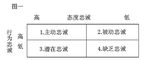 (2)顾客忠诚的分类。学者们对顾客忠诚定义的角度不同自然会对顾客忠诚产生不同的分类。依据态度可将顾客忠诚细分为:认知忠诚、情感忠诚和意向忠诚。认知忠诚是指顾客在购买决策过程中首先想到本企业产品和服务以及在各种产品和服务中首先选择本企业产品和服务的可能性;情感忠诚是指顾客在多次满意的消费经历的基础上形成的对企业的偏爱和情感。意向忠诚是指顾客与企业保持关系的意愿。除此之外,按照态度取向和行为取向两个维度可以把顾客忠诚划分为四种状态(如图一所示)。