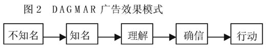 在此基础上,Russell H·Colley于1961年发表了著名的广告测定理论DAGMAR(Defining Advertising Goals for Measured Advertising Result)。库利认为,广告是经由(未知)认知、理解、确信、行为四个阶段来完成最终的销售目标,这一基本模式及理论成为了现代广告理论的基础,DAGMAR广告效果模式如图2所示。