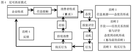 尼可西亚(Francesco M·Nicocia)主张把经济学中理性人的理论与行为科学中非理性行为研究结合起来,提出了尼可西亚模式,见图5。该模式把消费者的商品购买决策行为分为四大范畴,这一模式与信息处理模式有着诸多相似之处,关注重点在消费者通过处理信息形成态度、动机进而行动和反馈。
