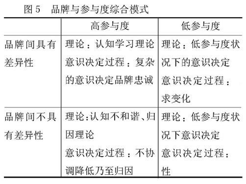 Henry Assael将品牌的参与度与品牌的差异性结合起来考虑,形成了品牌与参与度综合模式,其中有四种不同的购买行为模式,每一种模式中消费者决策的心理解释有所不同。这样就能更准确地描述不同消费者的行为,较之单一的认知学习模式有了较大的改进,而且此模式的另一个不同之处在于,它是非连续的,而其他模式多具有一定的连续性,涉及心理、信息或者决策的走向。