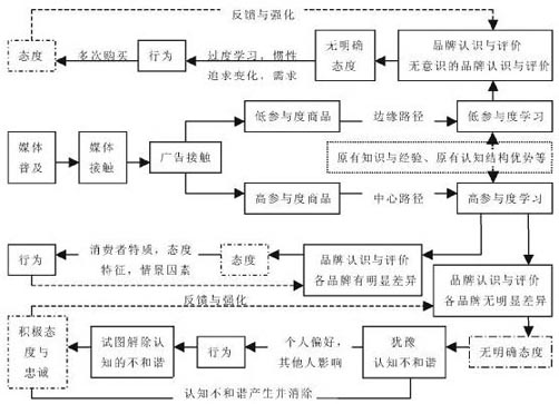 对于高参与度的商品,受众通过中心路径进行高参与度学习后会产生两种结果,即认为该类商品品牌之间无明显差异或有明显差异。进而在前一种状况下,受众不会形成明确的态度,即我们可假设受众若要购买商品,会认为这几种品牌相差不大,即消费者购买该商品后也可能会产生认知上的“不和谐”,并试图消除,若“不和谐”能圆满解决则可形成积极的品牌态度与忠诚;而对于后一种状况,受众将会有明确的态度,即表现出对该品牌的喜欢或厌恶。