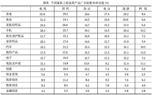 1.对于家电、手机等市场与产品均发展成熟、且产品同质化高、技术含量差异性小的产品,电视广告的优势并不明显。以家电产品为例:电视媒介中的家电产品广告消费者影响率为35%,而报纸和路牌上的家电产品广告消费者影响率亦分别达到了29.2%和20.2%(所谓消费者影响率是指广告所传递的产品信息对于多少消费者的购买行为会产生影响作用)。